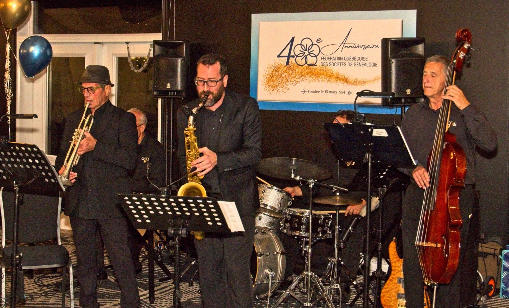Sous la musique du Grand Ensemble Jazz de Saint-Eustache, la soirée débuta avec le cocktail du 40e anniversaire de la Fédération, suivi du banquet, durant lequel sa présidente, Mme Jeanne Maltais, en profita pour souligner et récompenser le travail des anciens présidents et présidentes de la Fédération, des collaborateurs et collaboratrices du Fichier Origine (dont notre membre M. Jean-Marie Marquis), des membres du Bureau québécois d’attestation de compétence en généalogie ainsi que le travail acharné de l’ancien directeur général de la Fédération, M. Pierre Soucy.