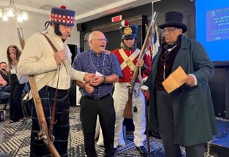 Une surprise attendait notre conférencier et citoyen M. Raymond Tessier à l’ouverture de sa présentation. Il fut arrêté et menotté par les militaires britanniques pour ensuite être libéré par les Patriotes. Cette mise en scène par les membres de la Société de reconstitution du Bas-Canada fut orchestrée par M. Michel Cyr, avec la complicité de MM. Claude Jean, Daniel- Claude Tremblay, Denis Thibault, Éric Lagarde et Mme Isabelle Mattioli. La soirée se termina par un cocktail de bienvenue.